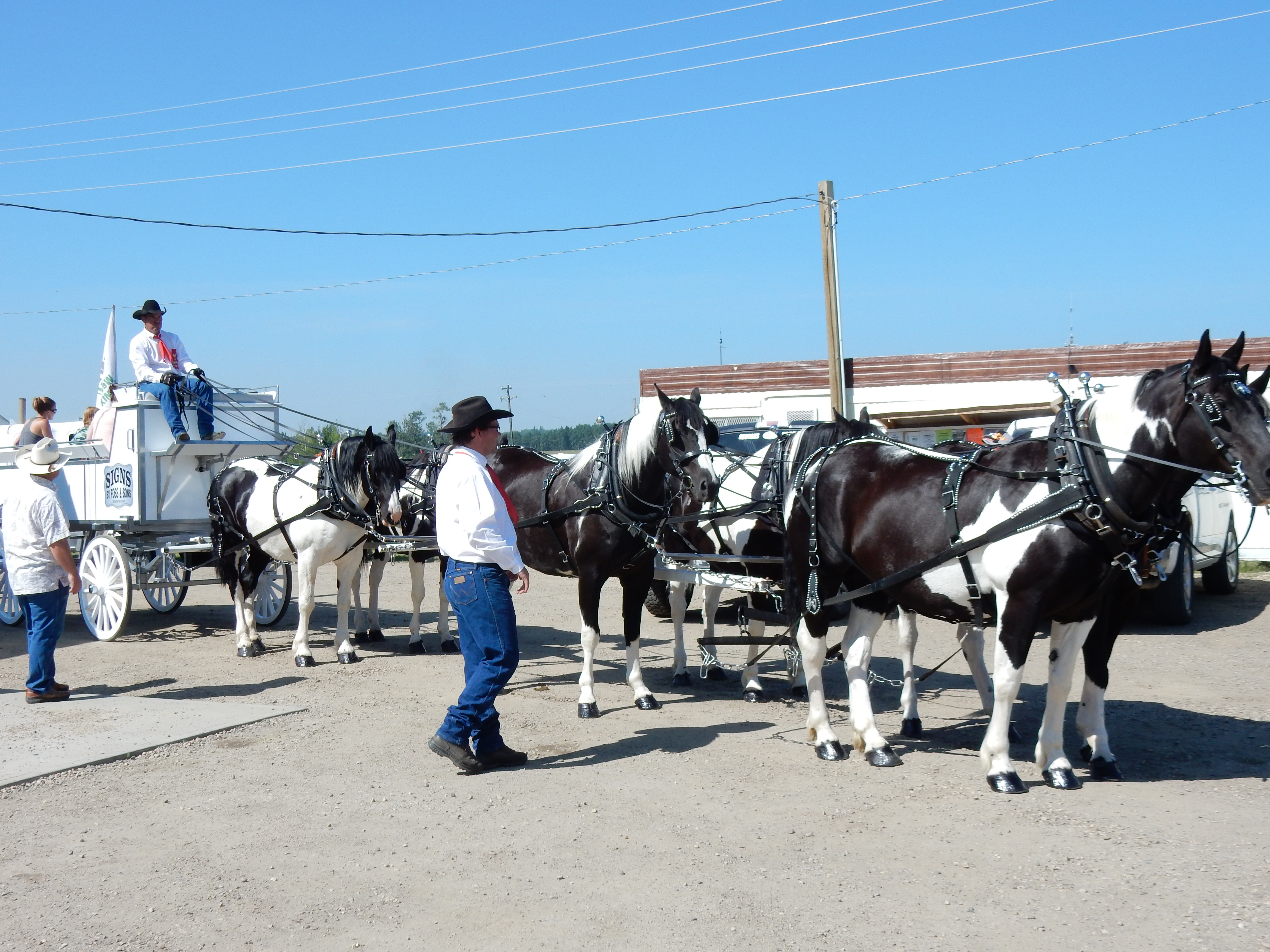 At precisely 11 a.m., a gleaming white wagon, pulled by a team of muscled draft horses, makes its way onto the highway. We cheer and applaud. After that, pretty much anybody from Buck Lake or any nearby town who wants to be in the parade, is in the parade. Of course, this is horse country, so there are lots of mounted entries.