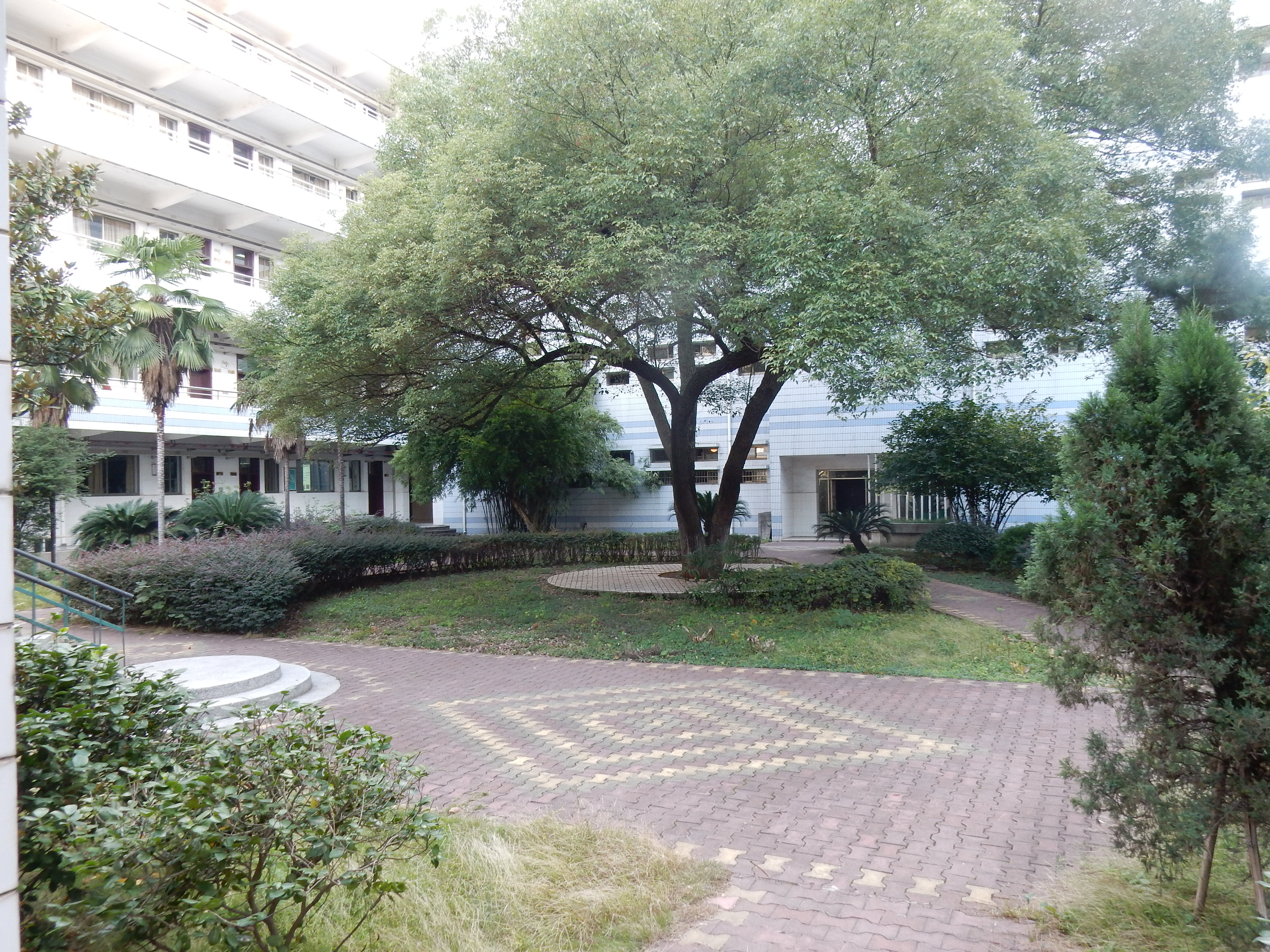 Campus is quiet, just a few students walking between buildings, and a couple of soldiers in forest green uniforms cycling past us. We head into the graduate student complex, and cross the small, slightly overgrown inner courtyard. In spite of its unkempt appearance, I marvel every day that I am teaching in a place where palm trees and clumps of bamboo shade my classroom.