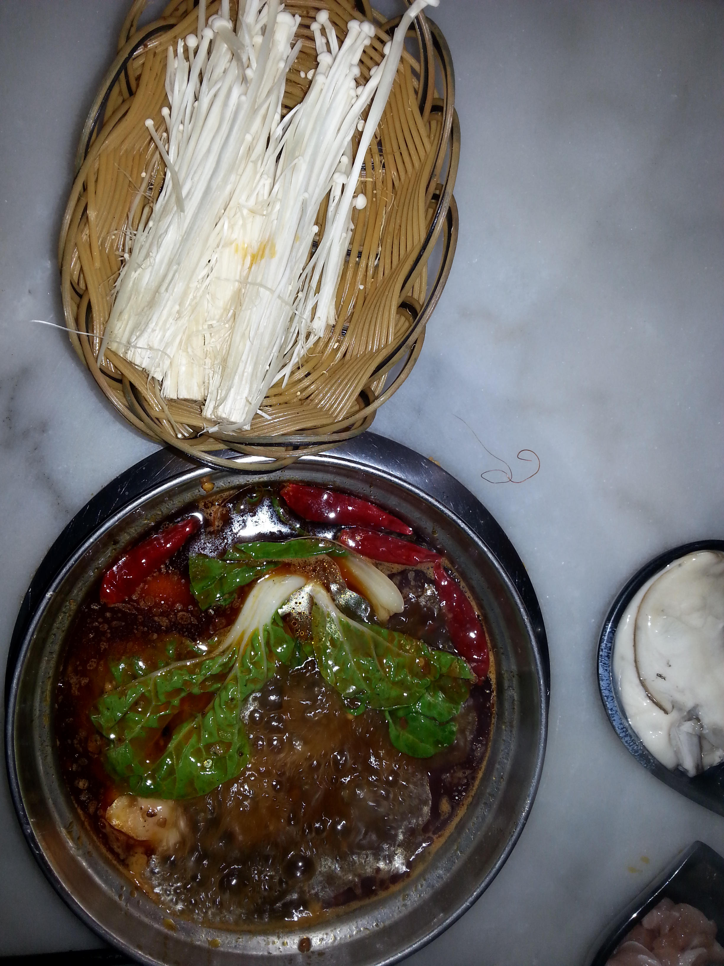 My friend told me to look under my end of the table for my cooking controls – an on/off switch, and a temperature gauge. Once I got my broth steaming, I plunked in various combinations of my chosen items – mussels, shrimp dumplings, chicken, “black fungus” (a type of tree mushroom) , as well as the complimentary vegetables – tomato and white mushroom wedges, baby bok choy, and needle mushrooms, so-named for their tall thin stalks and pin-sized heads.