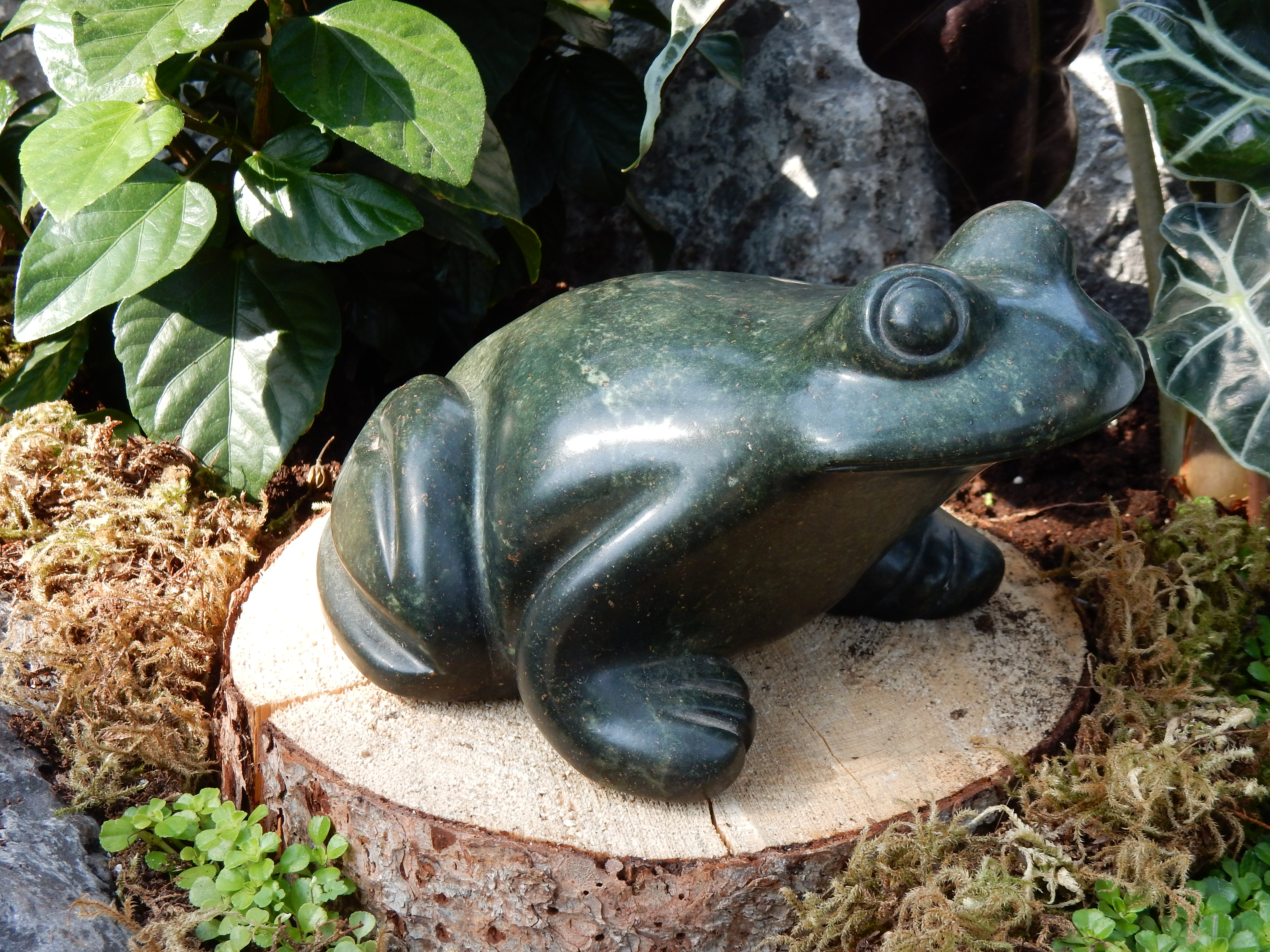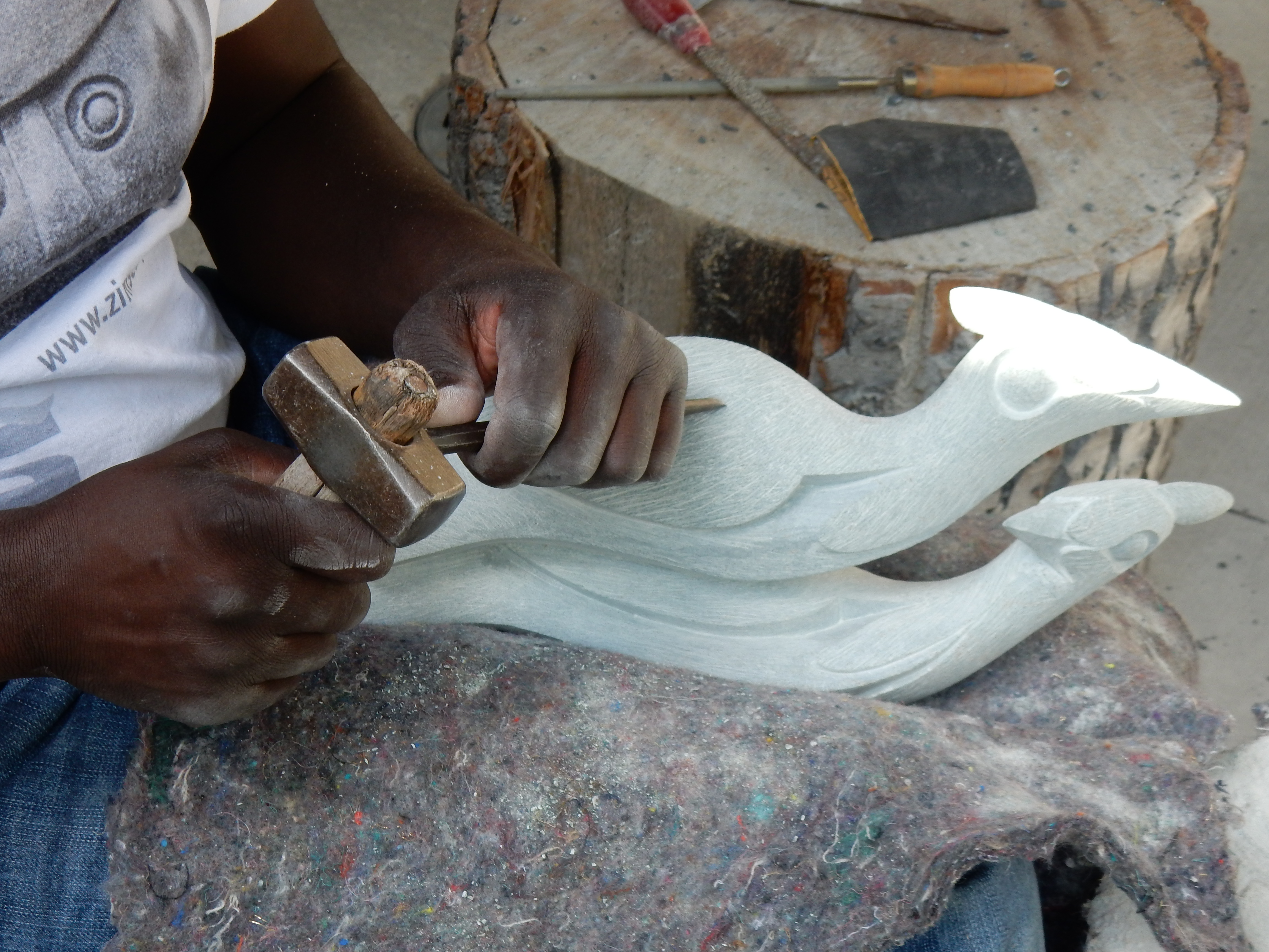 In the courtyard of the Conservatory, a few onlookers were standing respectfully behind a rope where two African sculptors sat under a canvas canopy, releasing the shapes hidden in blocks of springstone. The artists paused frequently to answer questions and chat, not seeming to mind when a little boy slipped under the rope and picked up their rasps, chisels, and hammers for a closer inspection.
