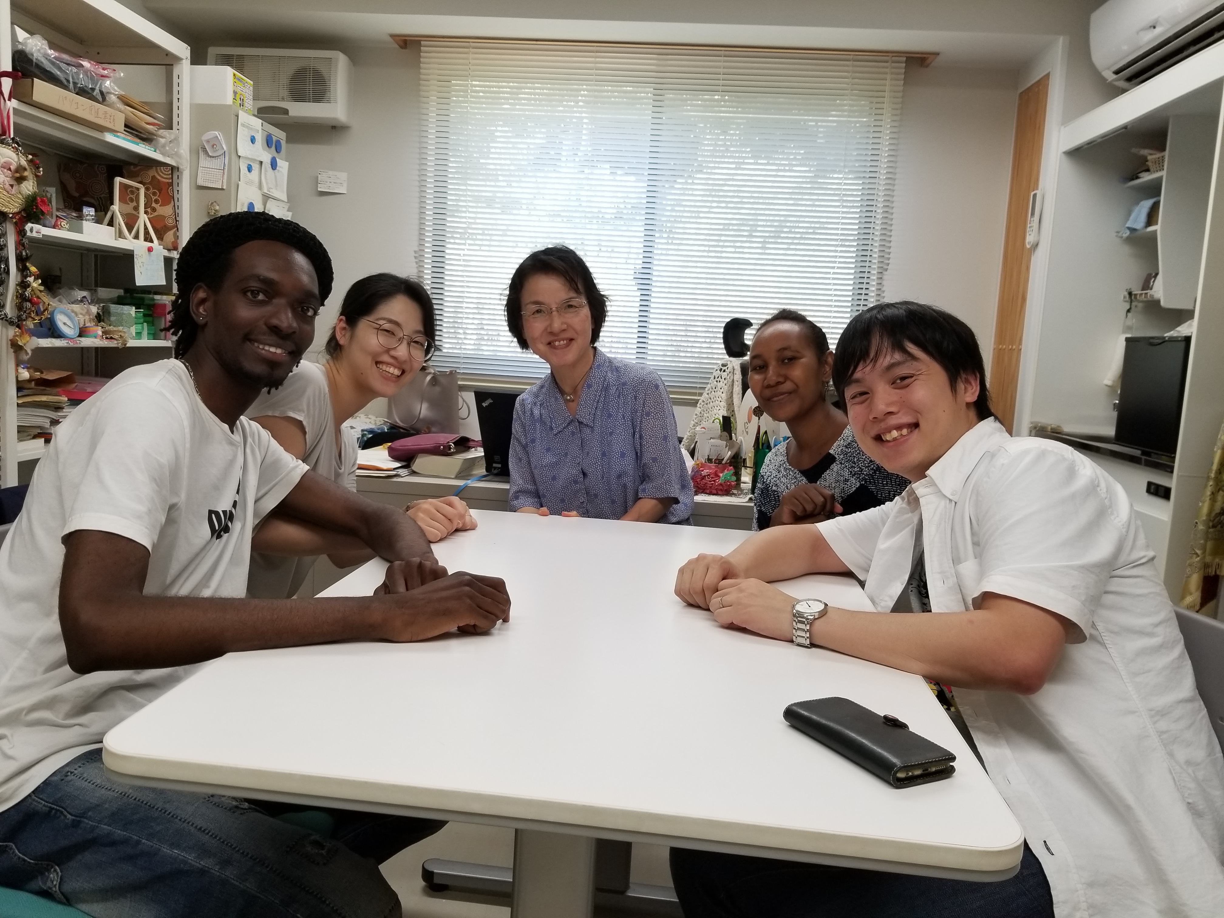 Japanese Studies is a graduate level class with only 4 students-2 from Japan, 1 from Gabon in West Africa and 1 from the Solomon Islands. I‘m surprised to see the class is being held in the professor’s office rather than a classroom. She welcomes me warmly when I arrive and asks me to make myself comfortable. I settle in at the back of the office on a comfy white couch while the students sit at a small table in front of the professor’s desk.