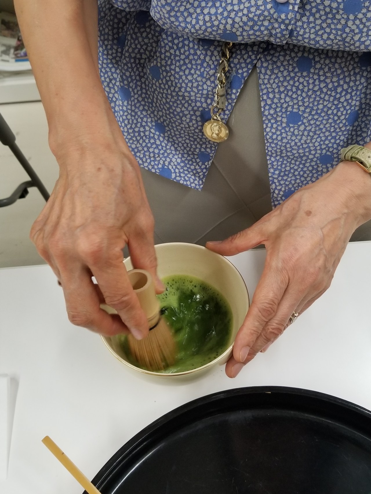 An hour later, I’m sitting down with the professor and one of the grad students, Kaori Yanata, who is researching spiritual and religious tourism in Japan. Dr. Takehana asks us each to choose a bowl for our tea and offers marble-sized rice cracker balls drizzled in caramelized sugar “because the tea can be a little bitter.” She spoons a little lime-green powdered tea into each bowl, adds hot water and whisks until the water foams. Then she hands us our bowls and invites us to drink.