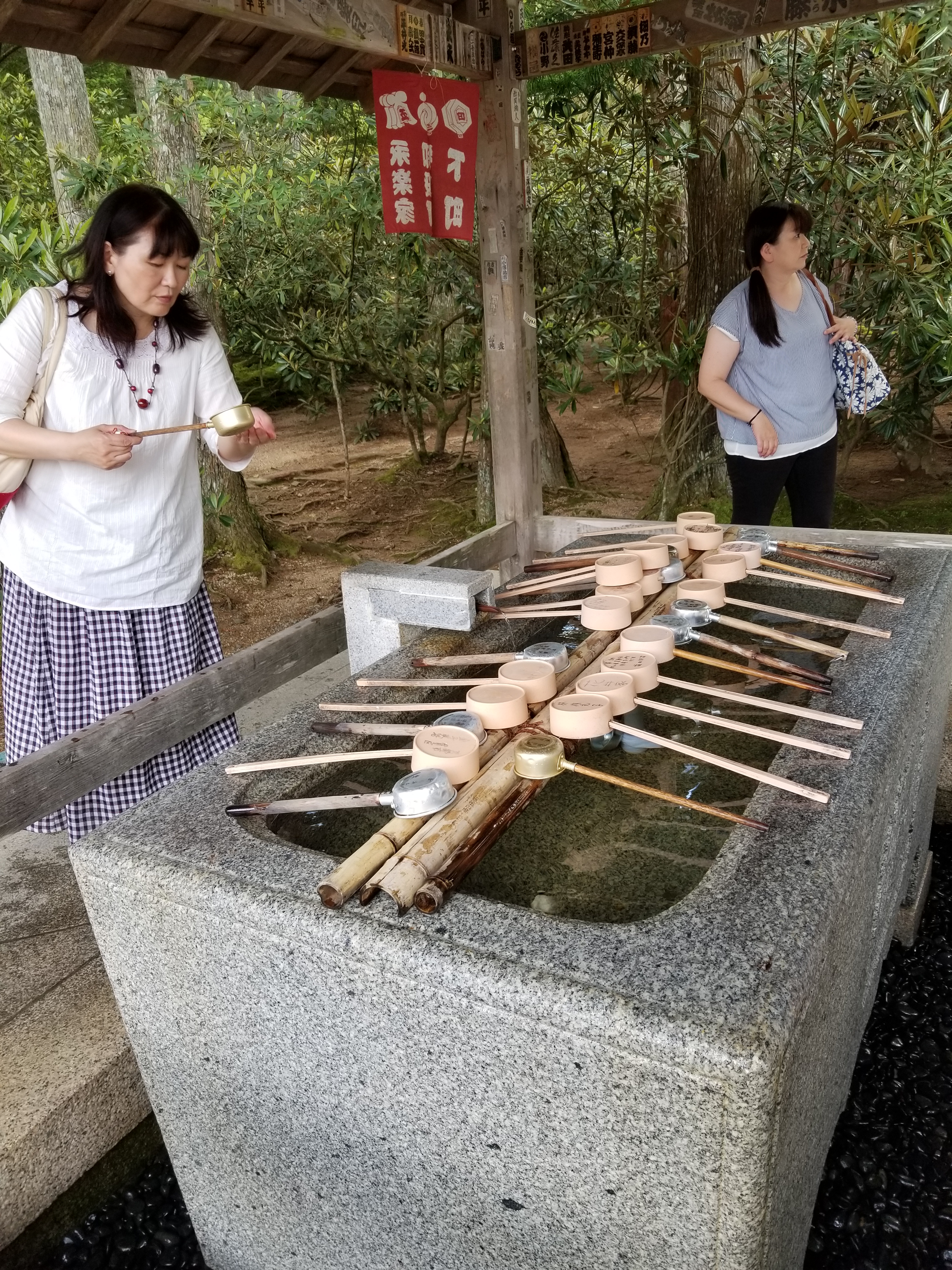 Before we entered the monks’ training area, we stopped at a purification well. Kazue showed me how to pour a dipper of water first over my left hand, then my right. Then I poured enough water into my cupped left hand to sip from and spit out before pouring the remainder of the water in the dipper back over its handle and replacing it for the next person to use.