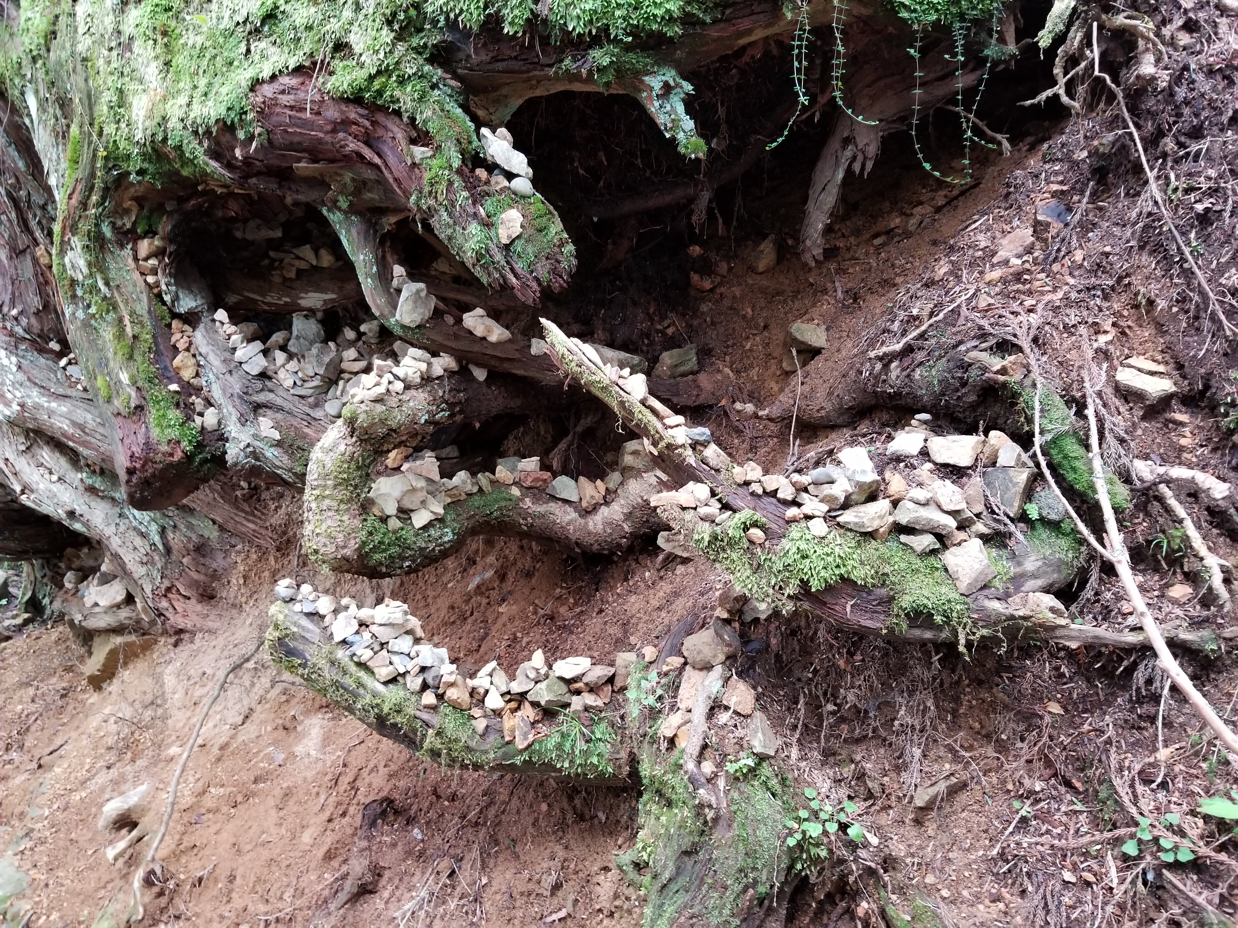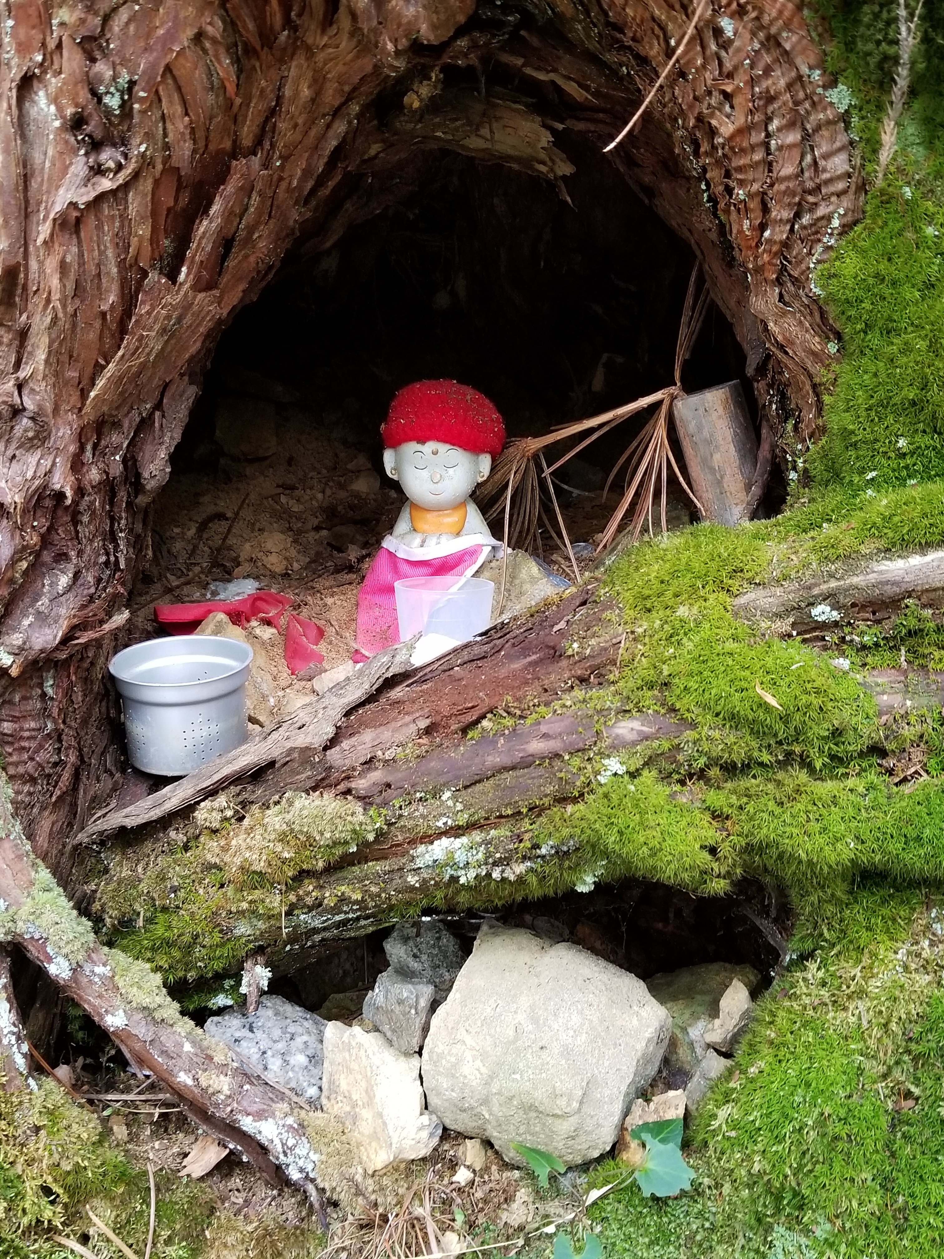 On the way back to the  car, there were still more sights to see. Some Kazue could explain to me: the stones lined up at the base of a tree are placed there for good luck.  But the tiny figure in a natural alcove remained a mystery to us both.