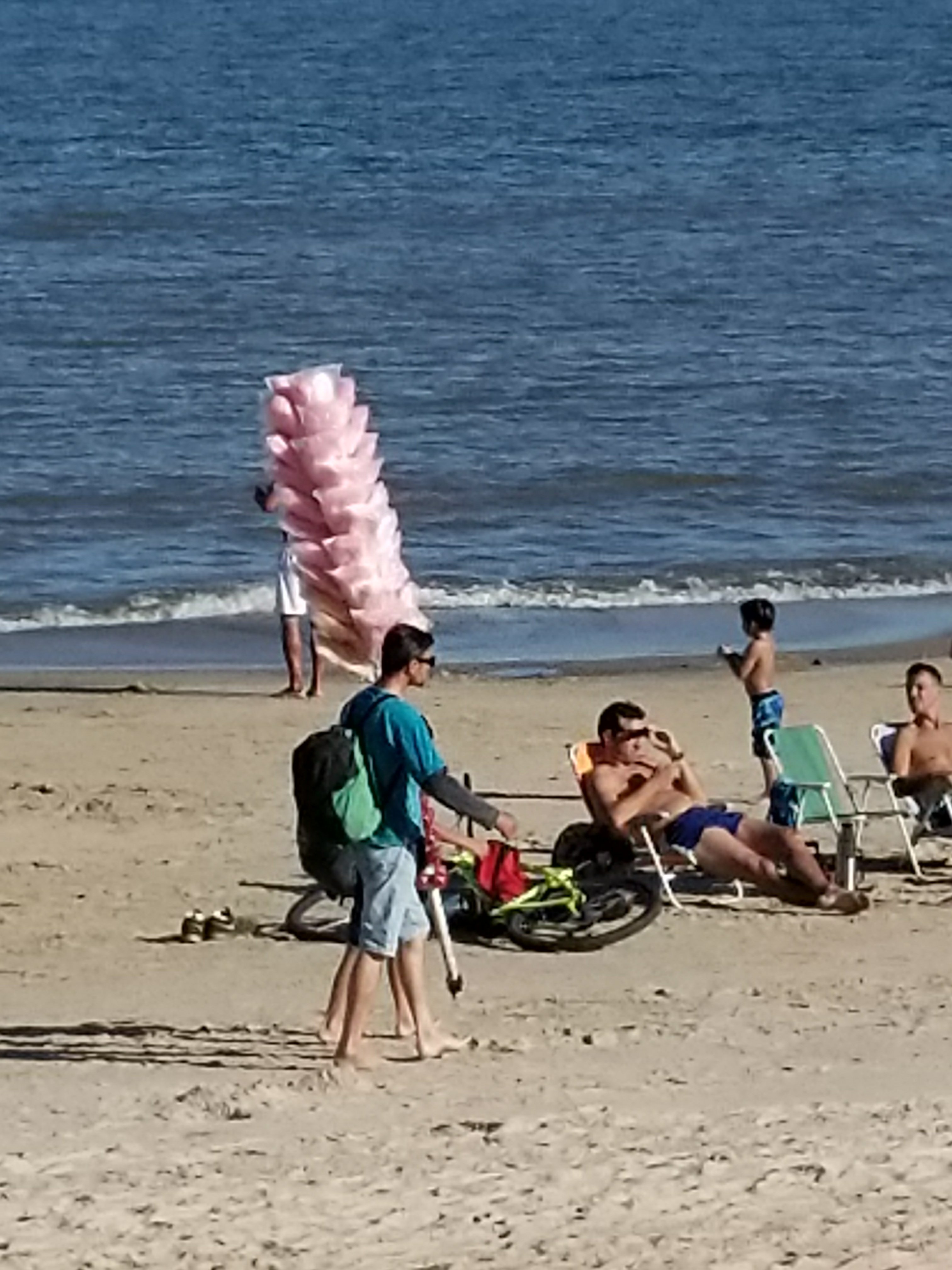 The crowd separates itself into two groups- the beach-goers and the sidewalk browsers. I figure the Atlantic hasn’t warmed up quite enough for swimming yet because only a brave few are in the water. Most people are lounging on the sand, showing off sometimes-more, sometimes-less beach-ready bodies, playing volleyball or soccer, or flagging down the snack vendors.