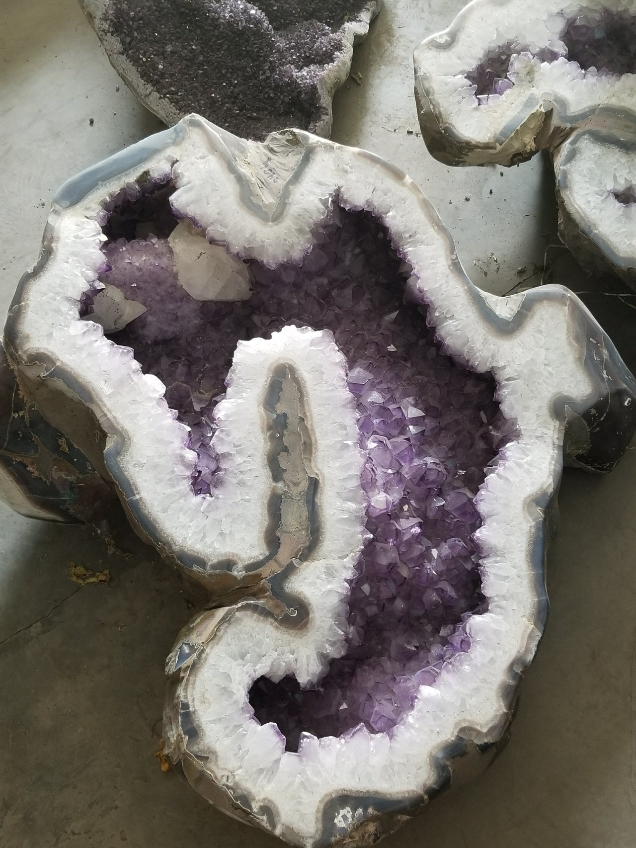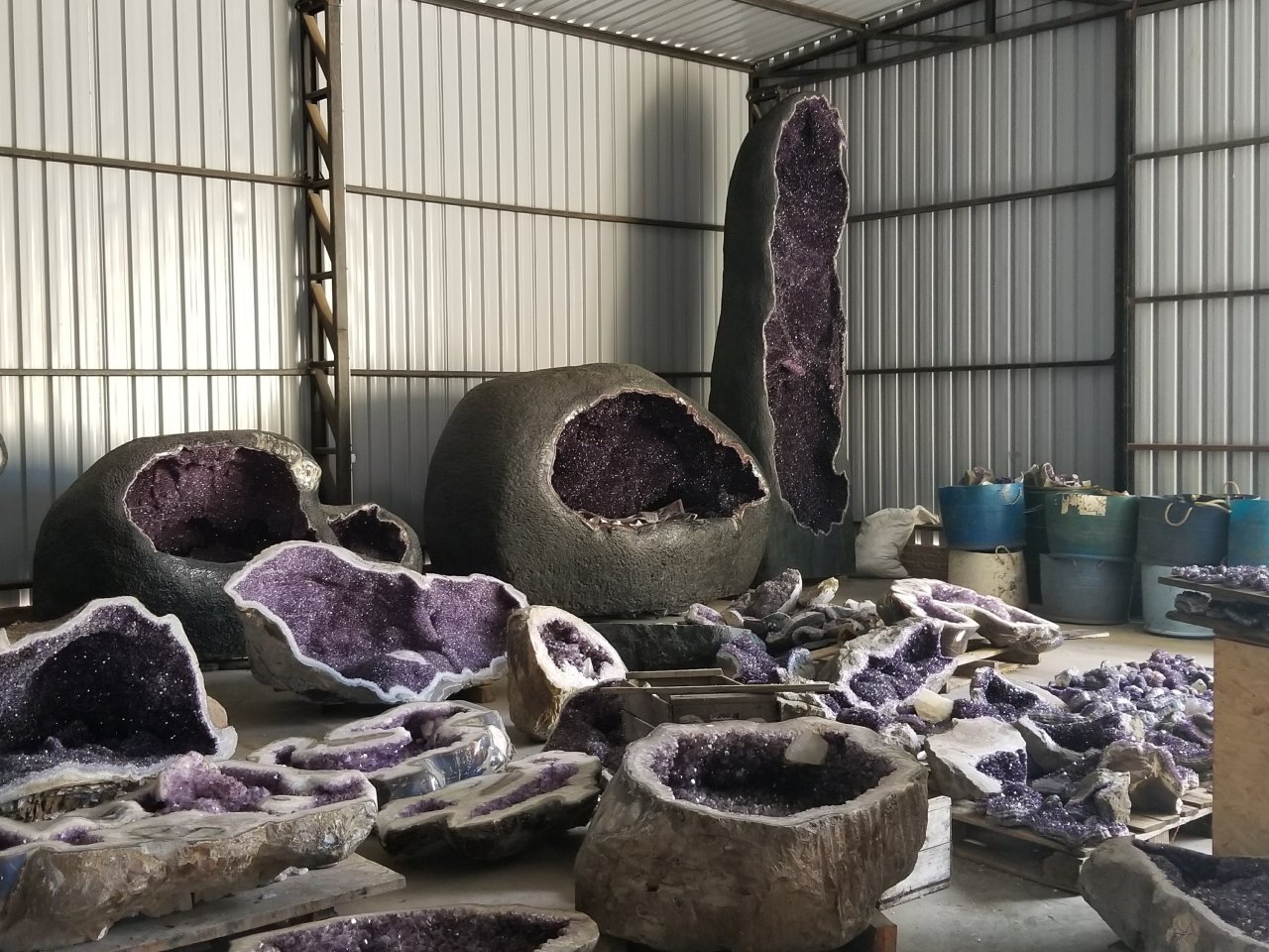 But one building quite literally dazzled me- the area where the geodes were stored as they awaited shipment. The size and brilliance of the purple crystals, some of them interspersed with contrasting milky-white calcite, produced snowflake-unique designs unlike any I’ve ever seen.