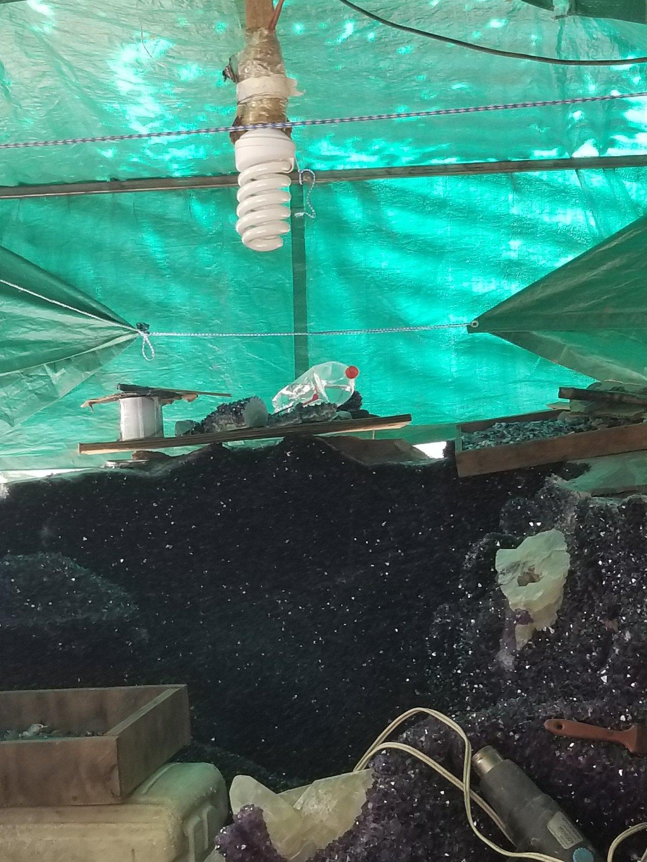 Inside, we followed the beam of Antonio’s flashlight, picking our way over stones, avoiding mud puddles, and following a makeshift walkway of two by fours until we reached the massive geode. Antonio said crews had been working to extract it for 5 months and had at least that many more months left to complete the job. But with the market for amethysts currently low, the geode may have to stay below ground for much longer than that.
