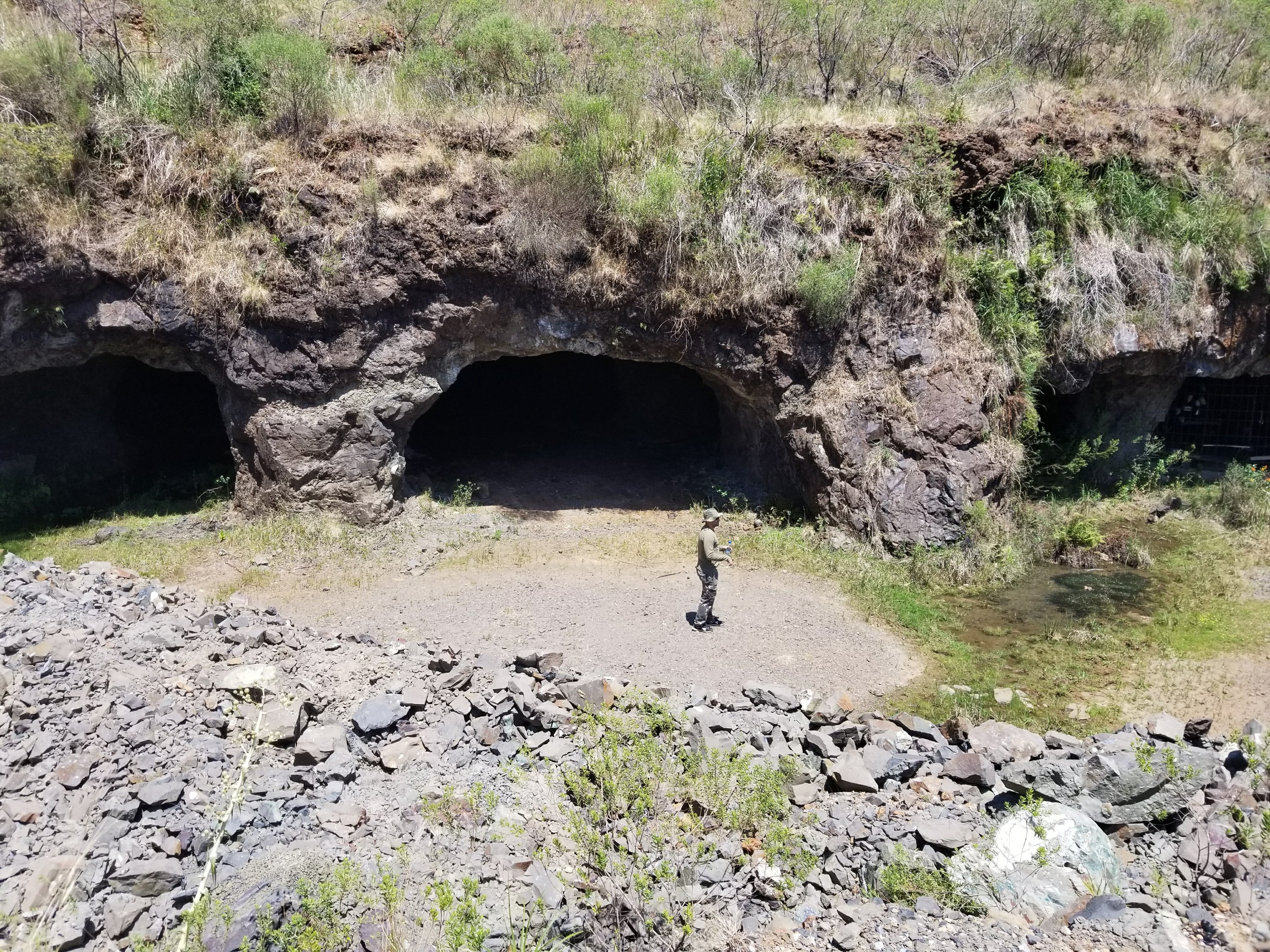 A few minutes later, we left the workshop and got back on the now-gravel main road for a trip to what Antonio called a gallery to see a geode in its natural state. We bounced along in a cloud of orange dust as the road stones pinged and thudded against the van’s undercarriage and the driver swerved to avoid potholes. Finally, we swung into what initially looked like pasture land and Antonio led us to the edge of a cliff where we could see the openings to the gallery below. He scrambled down and we followed.