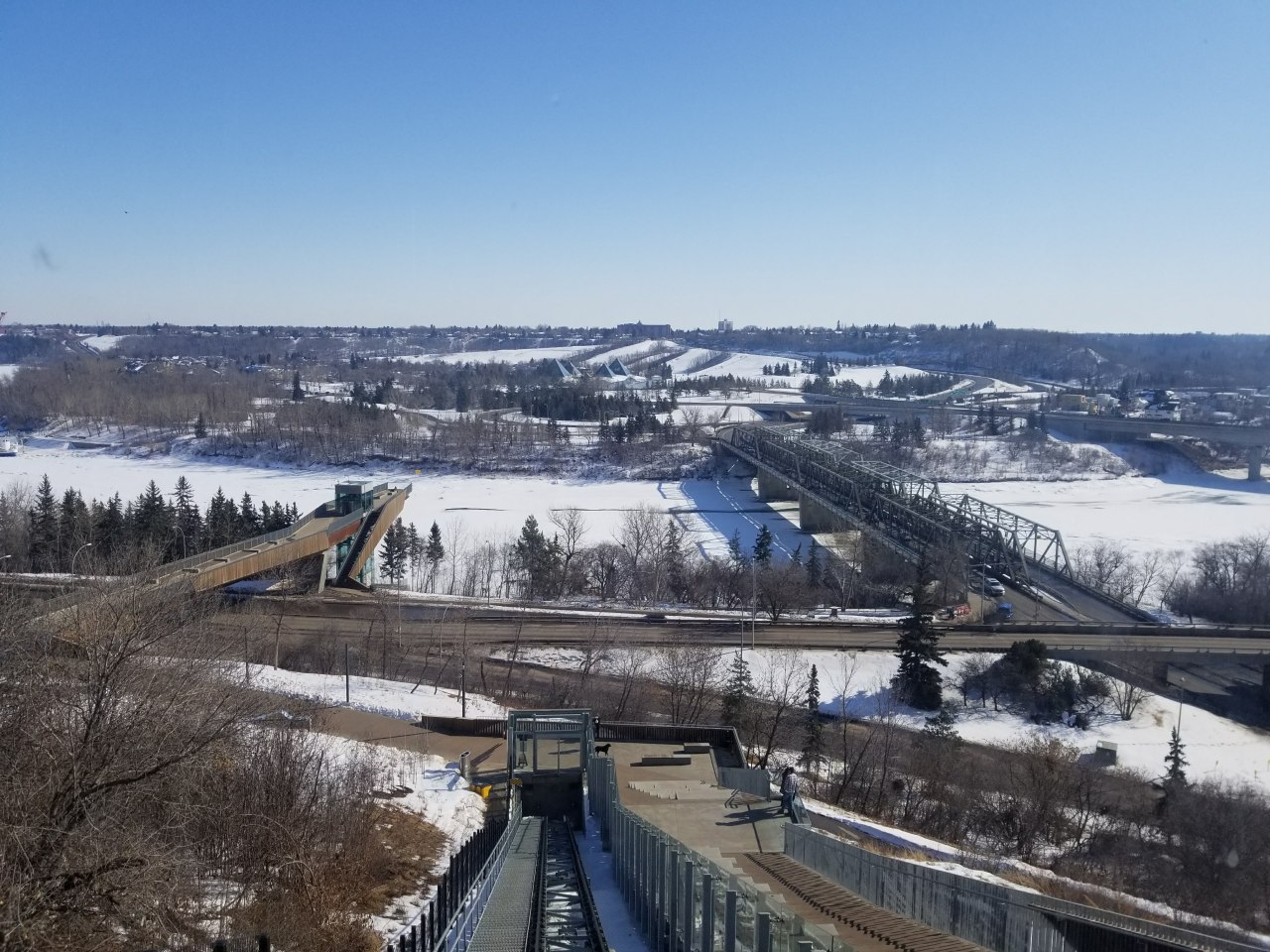Last weekend, I hoofed downtown to experience Edmonton’s new funicular. All winter, I’d been watching it get built from my bus on the way to work, but now I needed to try it out for myself. Designed to provide quicker, more direct connections between downtown and the river valley, with stunning views from its floor-to-ceiling windows, it whisked me and other curious explorers from the snowy pathways below the Low Level Bridge to the top of 100 Street in record time.