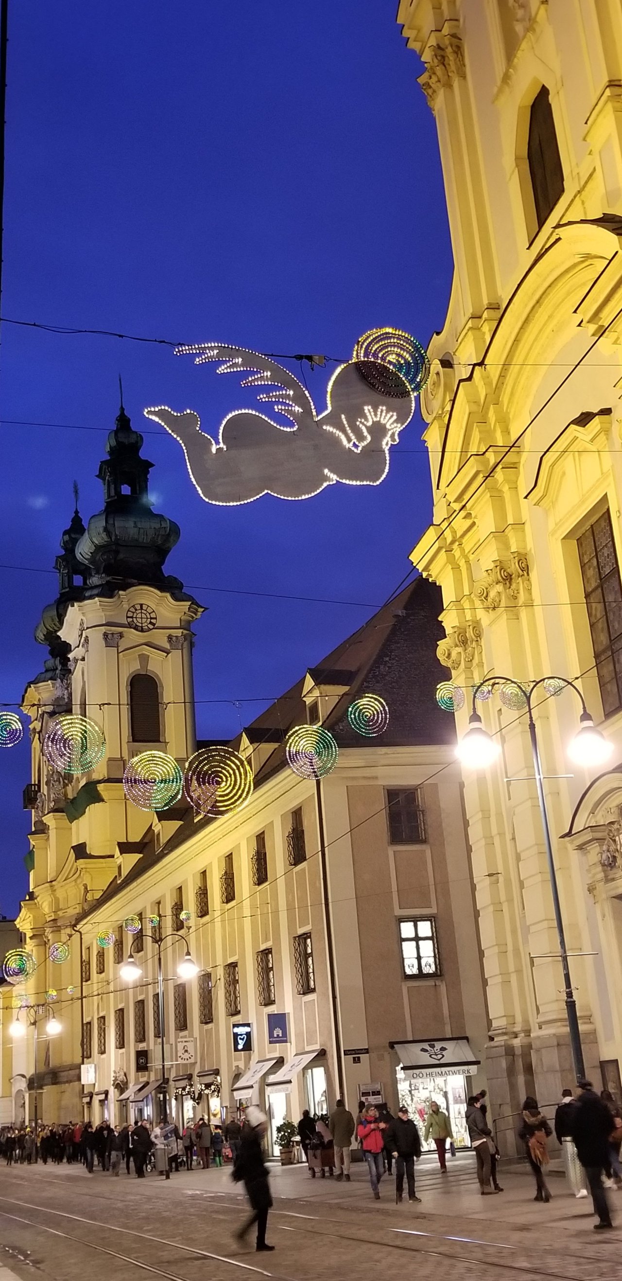 Not much later, as dusk fell, the Christmas lights winked on – over the streets, on balconies, and in the markets. Though not the grand display I had seen in Vienna, their simplicity, dignity, and occasional humor suited the low key vibe of Linz.