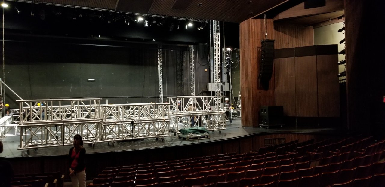 We then visited the Eric Harvie Theater, where crews were using the huge stage to assemble parts of the scaffolding for the operas’ outdoor amphitheatre. This too was part of the Centre’s educational mandate. The safety training the crews were receiving would help to ensure that some of the accidents that have occurred at other outdoor venues in Canada don’t happen here.