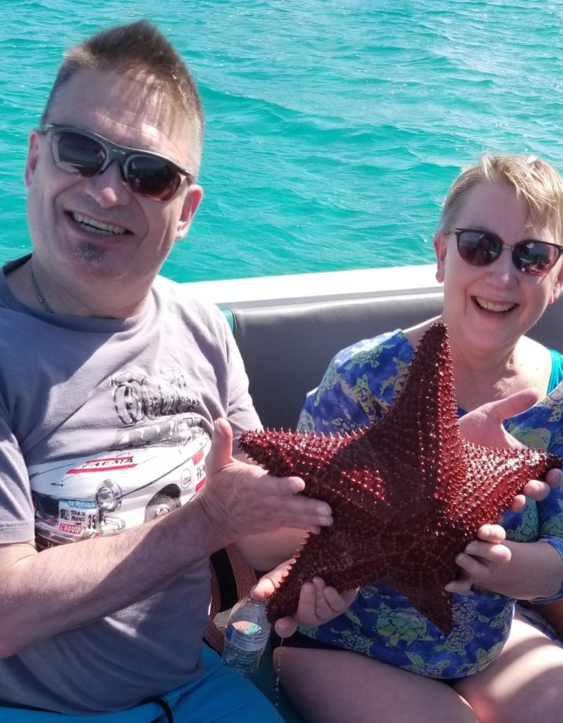 As we motored along between cays, our captain cut the engines and one of the crew dove into the shallow waters of an unofficial starfish reserve. He returned with a huge burgundy specimen. I’d never actually held a live starfish before, so feeling its prickly exterior was an interesting experience. Not to worry, animal activists – the crew returned him to his home in just a few minutes.