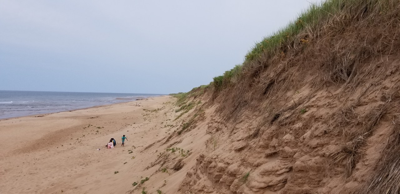 We didn’t realize then – and maybe scientists didn’t either – the fragility of the sand dune ecosystem of which marram grass is a part. Trampling it – much less sitting on it – causes irreversible damage to sand dunes. Now, on PEI, there are fences and warning signs alerting people to “stay off the grass” and avoid climbing on the dunes.