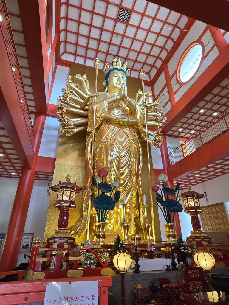 In a hall all its own, for obvious reasons, stands the largest wooden statue in Japan, an 11 metre tall representation of the Senju Juichimen Kannon, a Buddhist deity with a thousand arms and 11 faces, resplendent in lacquer and gold leaf.